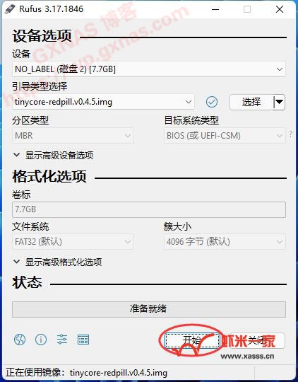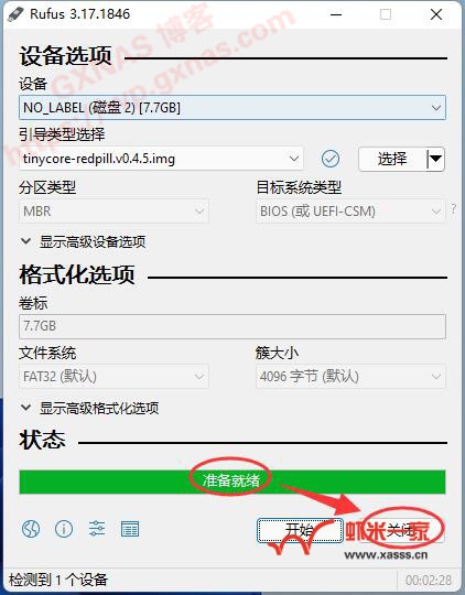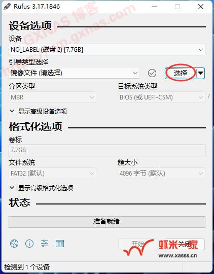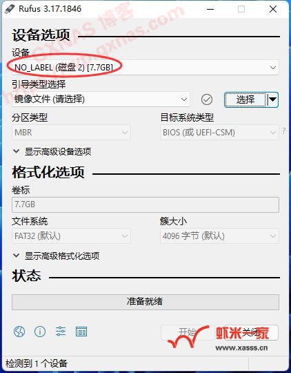 四、如果是物理机安装群晖的,先准备一个U盘插到Windows系统的电脑(不是NAS主机哦)的USB口,然后在电脑上打开rufus写盘工具(电脑没有这个软件的,可在rufus官网下载或者GXNAS网盘下载),先确认一下设备那里显示的U盘是否正确。