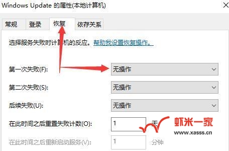 5、点击「恢复」,第一次失败处选择「无操作」,然后点击「应用」、「确定」。