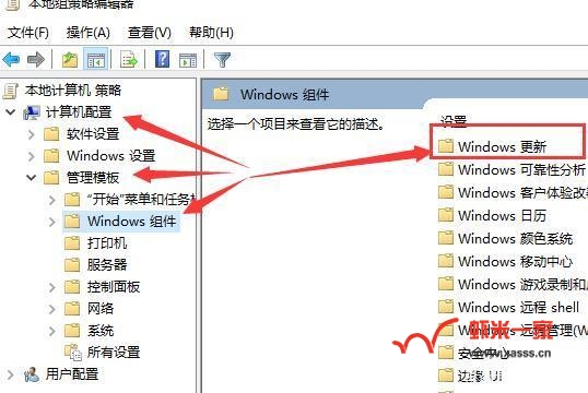 7、依此选择「计算机配置」、「管理模板」、「Windows组件」双击「Windows更新」。